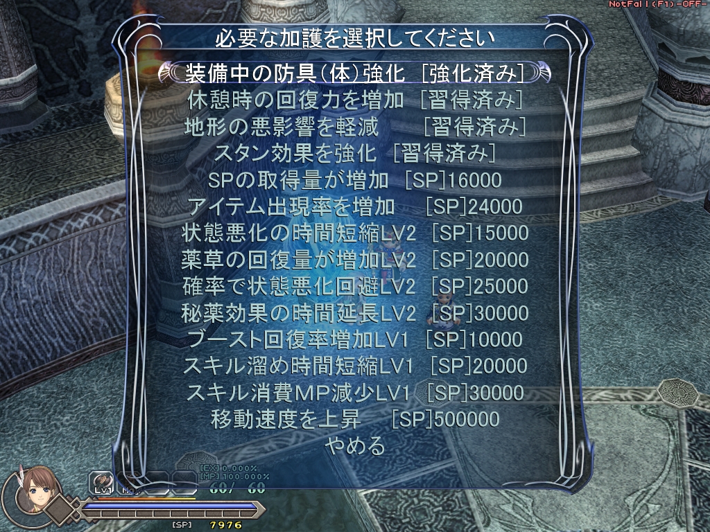 ゲームをクリア後に「1万」と聞いても,いま一つ実感がわきにくいかもしれない。が,しかしゲームの開始直後という点を考えると,これはかなりの効果。SP1万あれば6〜7種類の「女神の加護」を得られるのだ(どれを選ぶかによっても微妙に違ってくるが)。本作では主人公が3人いるとはいえ,そうそう何度も最初から始めることは少ないかもしれないが,たとえばHARDモードでのプレイの場合などに役立ててほしい。